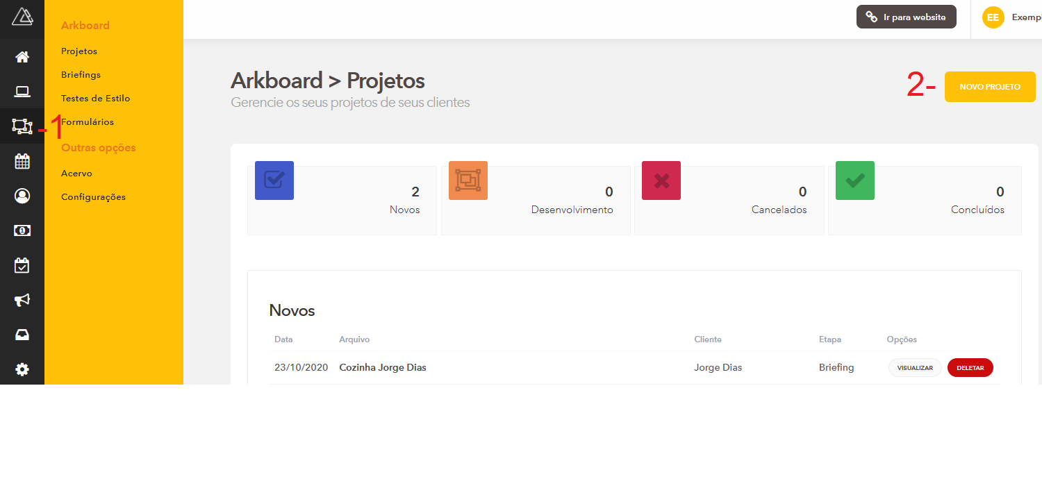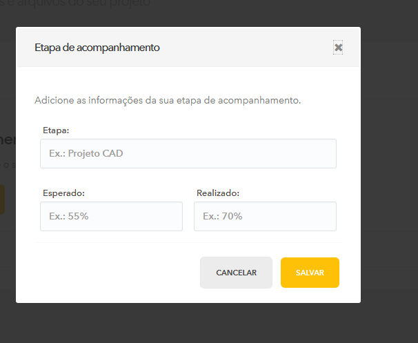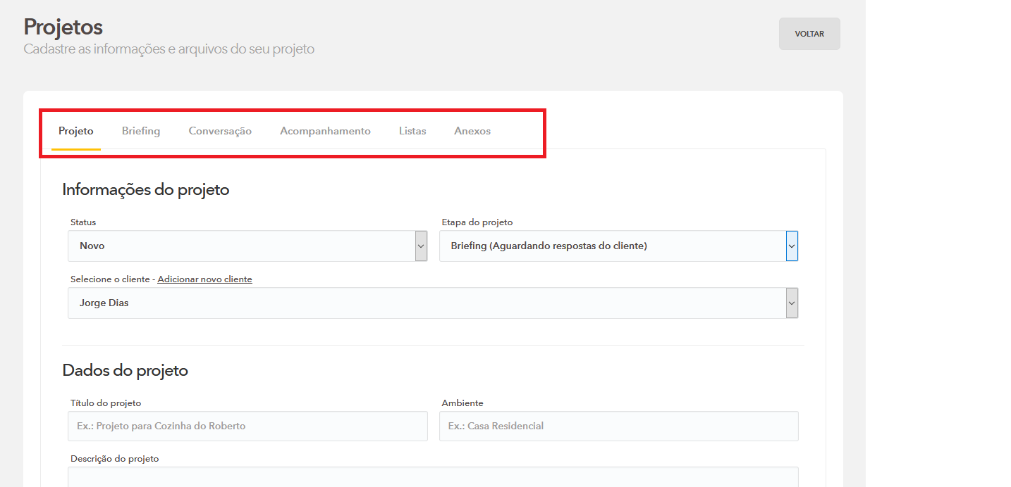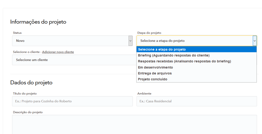 Feito o cadastro do cliente já podemos cadastrar o projeto, onde iremos criar ele desde o começo, título descrição etc, assim como selecionar a etapa do mesmo.